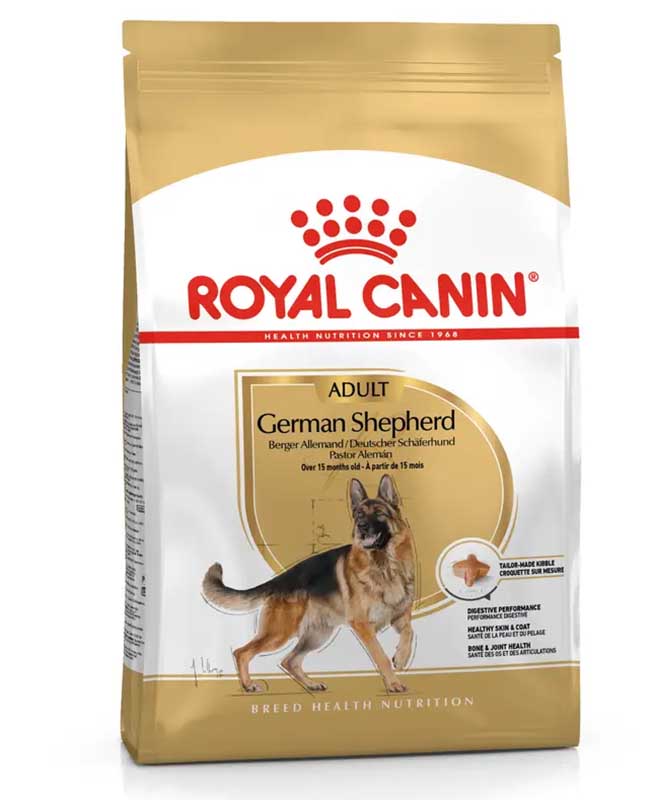 ROYAL CANIN® German Shepherd Adult est spécialement formulé pour répondre à tous les besoins nutritionnels de votre chien adulte et convient aux Bergers allemands de 15 mois et plus. ROYAL CANIN® German Shepherd Adult favorise une santé digestive optimale grâce à sa teneur en protéines L.I.P. hautement digestibles et à une sélection de fibres spécifiques qui limitent la fermentation intestinale et contribuent au maintien du bon équilibre de la flore intestinale. ROYAL CANIN® German Shepherd Adult est spécialement conçu pour aider à renforcer le rôle de barrière de la peau. Cette formule spécifique contient également des acides gras oméga-3 EPA et DHA, des nutriments qui ont pour fonction de préserver et de nourrir la peau et le pelage de votre chien. Le Berger allemand est connu pour son tempérament vif et sa forte participation aux activités. C’est pourquoi un régime alimentaire contenant des nutriments qui favorisent la santé des articulations peut contribuer à maintenir le haut degré d’activité de cette race. C’est pourquoi ROYAL CANIN® German Shepherd Adult est enrichi en nutriments spécifiques afin de préserver la santé des os et des articulations. De plus, cette formule contribue également au maintien du poids de forme de votre chien.